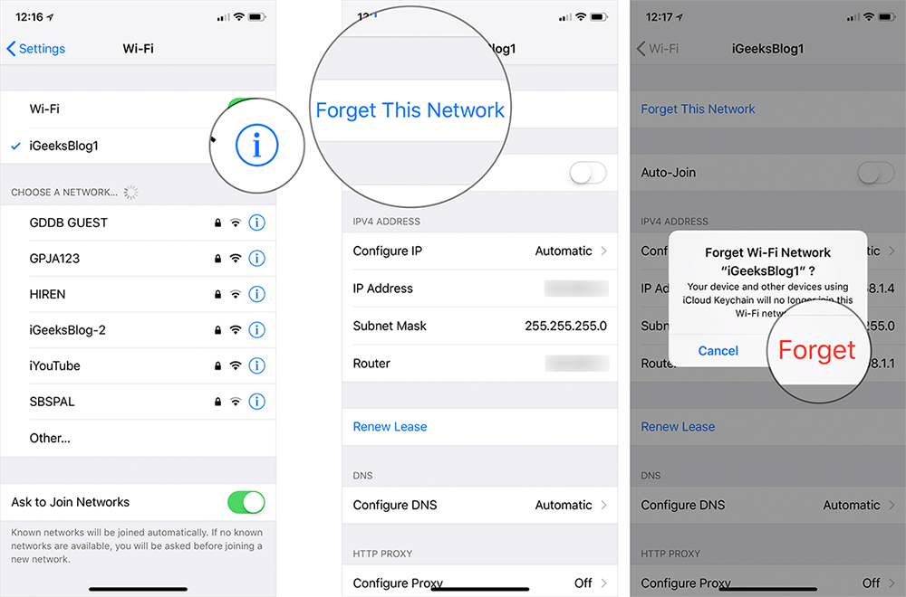 Step #2. Now, you need to tap on the “i” button next to a Wi-Fi network. Now, tap on Forget This Network and confirm.
